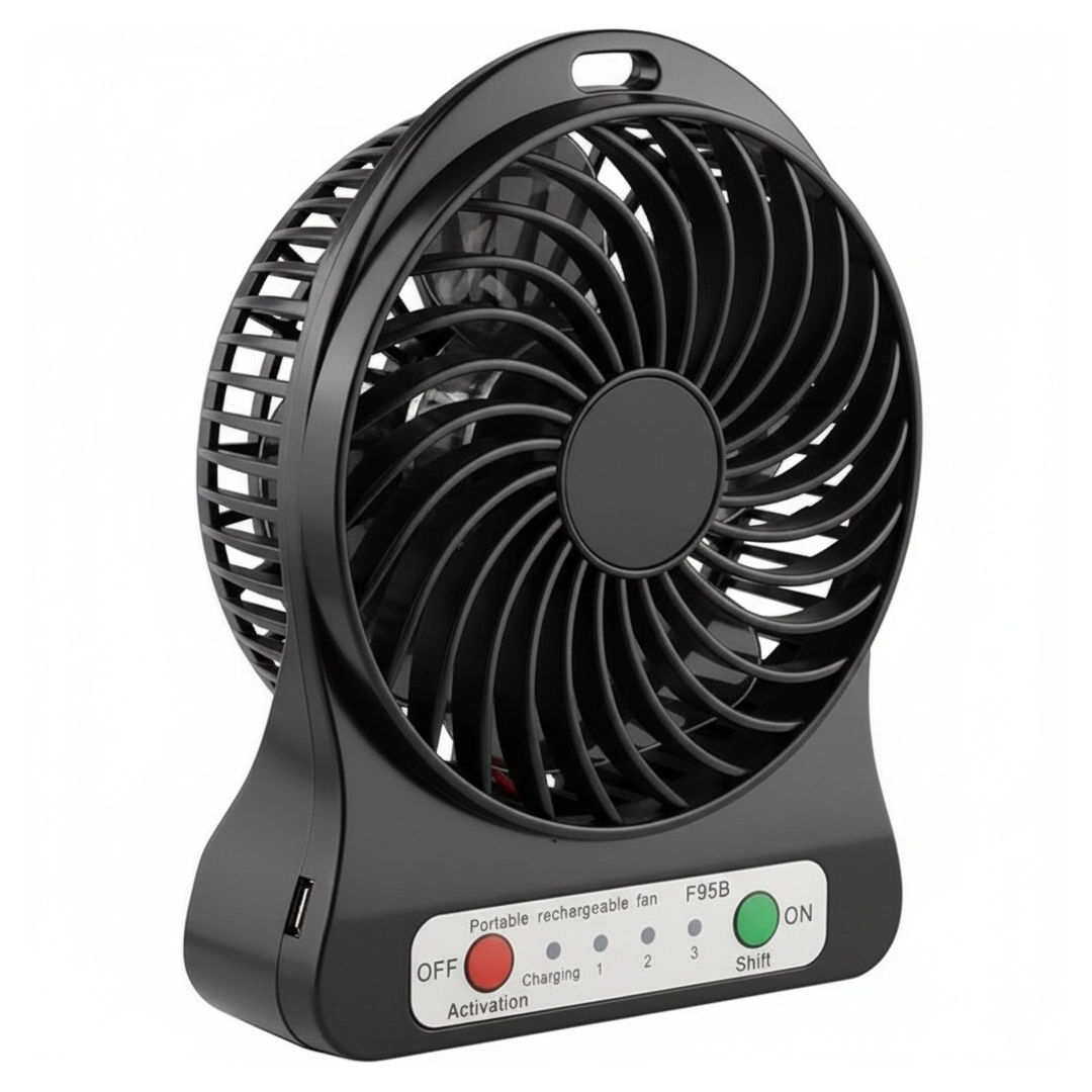 پنکه شارژی دستی و رومیزی مشکی – خنک‌کننده پرتابل با باتری بادوام (USB)
